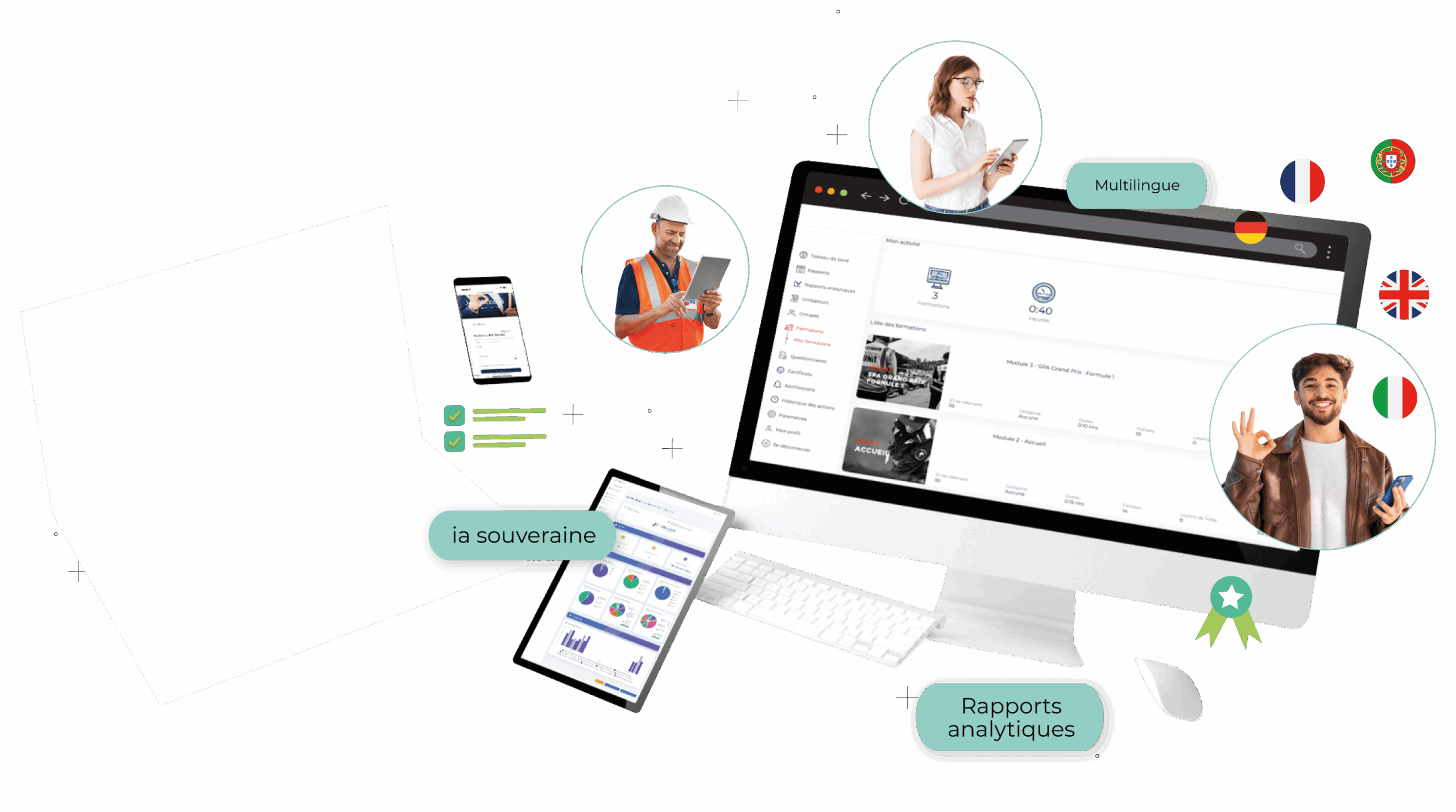 Quiz personnalisés, certificats automatiques avec validité paramétrable, notifications email pour administrateurs et apprenants.